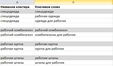 Працювати з великим списком ключових слів незручно. Зазвичай їх компонують в групи по ряду ознак і працюють окремо з групою. Список груп ключових слів може допомогти зрозуміти, наявність яких розділів важливо на сайті, скласти оптимальну структуру.